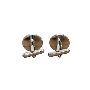 Handmade, one-of-a-kind cufflinks featuring upcycled watch parts in clear resin with a silver-colored finish. - Materials: Upcycled watch parts in resin - Measurements: 0.7 in diameter and 0.5 in post length- Made in United States - Item #: 63819
