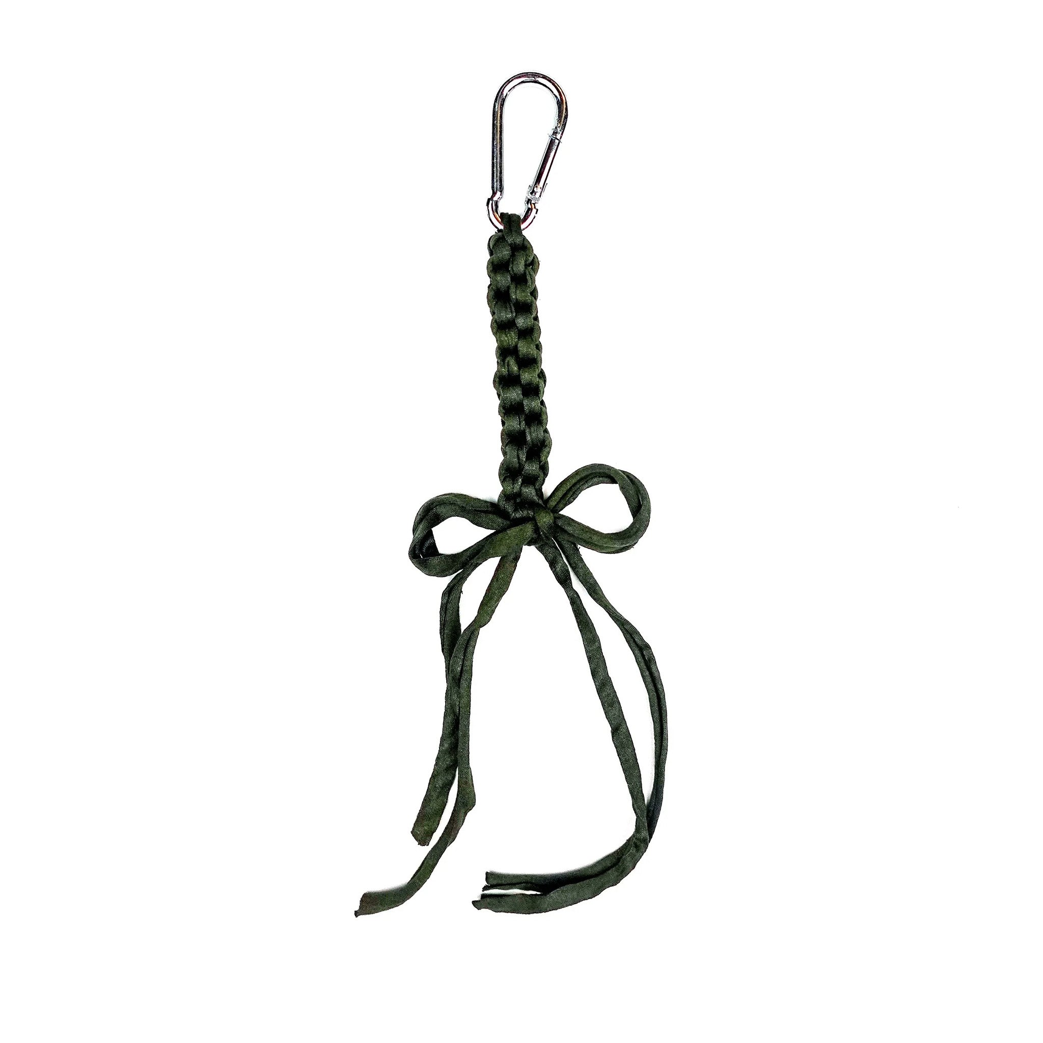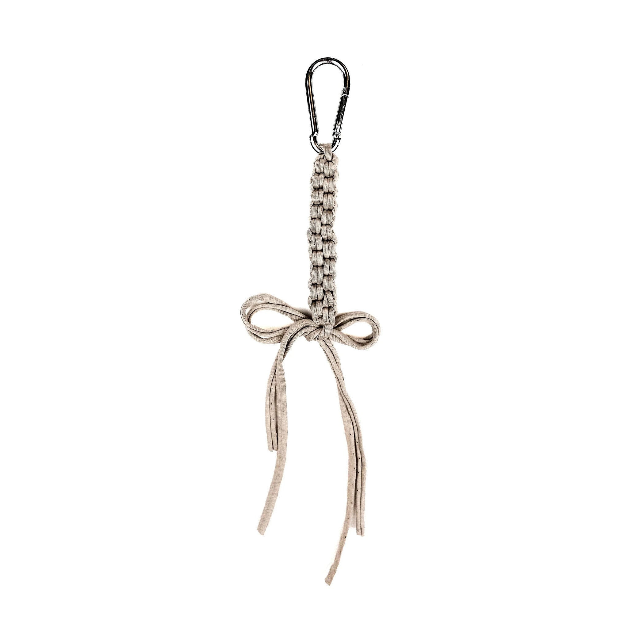 Handcrafted using leftover yarn from reclaimed t-shirt fabric, these charms feature unique texture and neutral colors to add a pop of personality, while the sturdy stainless-steel carabiner ensures easy attachment and security. These versatile charms can be attached to your backpack, purse, keyring, or belt loop.