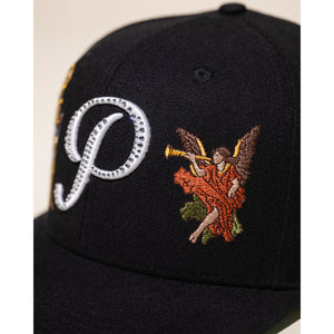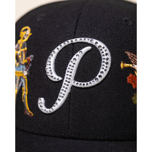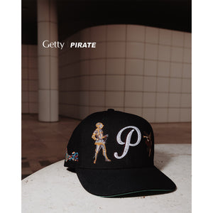 - Rhinestone finish on front panel embroidered Pirate script “P”