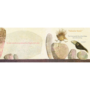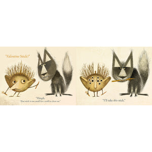 Stickler, a one-of-a-kind creature made of sticks, is giving his friends Valentine’s Day sticks, but none of them are interested in Valentine’s sticks. Crow says he prefers fine, shiny things, Beaver likes receiving funny cards, and Wolf doesn’t care for Valentine’s sticks – they’re too small to chew on! When Stickler tries to offer Cat a Valentine stick, she does not want one. “Hmm…” he wonders, “Maybe Valentine’s Day is not about what Stickler loves, but what others love.”
