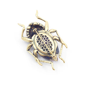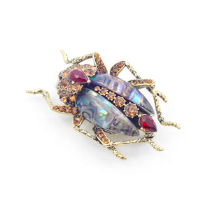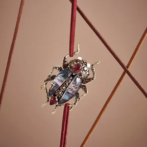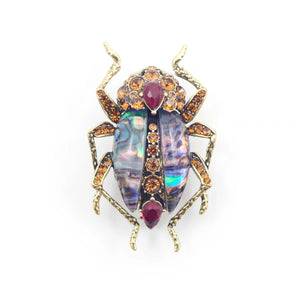 This showstopper features bespoke resin stones reminiscent of labradorite, and hand-set crystals meticulously crafted to form the body of this beautiful beetle. The antique gold finish lends a vintage feel, making it a true standout piece.