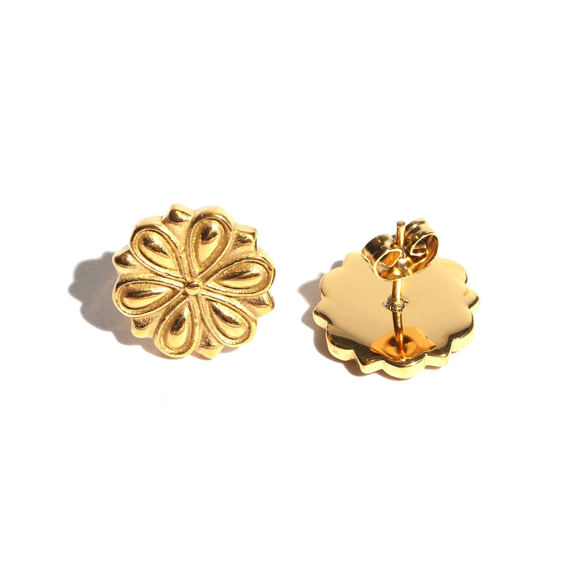 Classic rosette‑style stud earrings crafted in 24K gold‑plated stainless steel for a warm, sculptural glow. Timeless and versatile, they add a refined decorative accent to everyday looks.