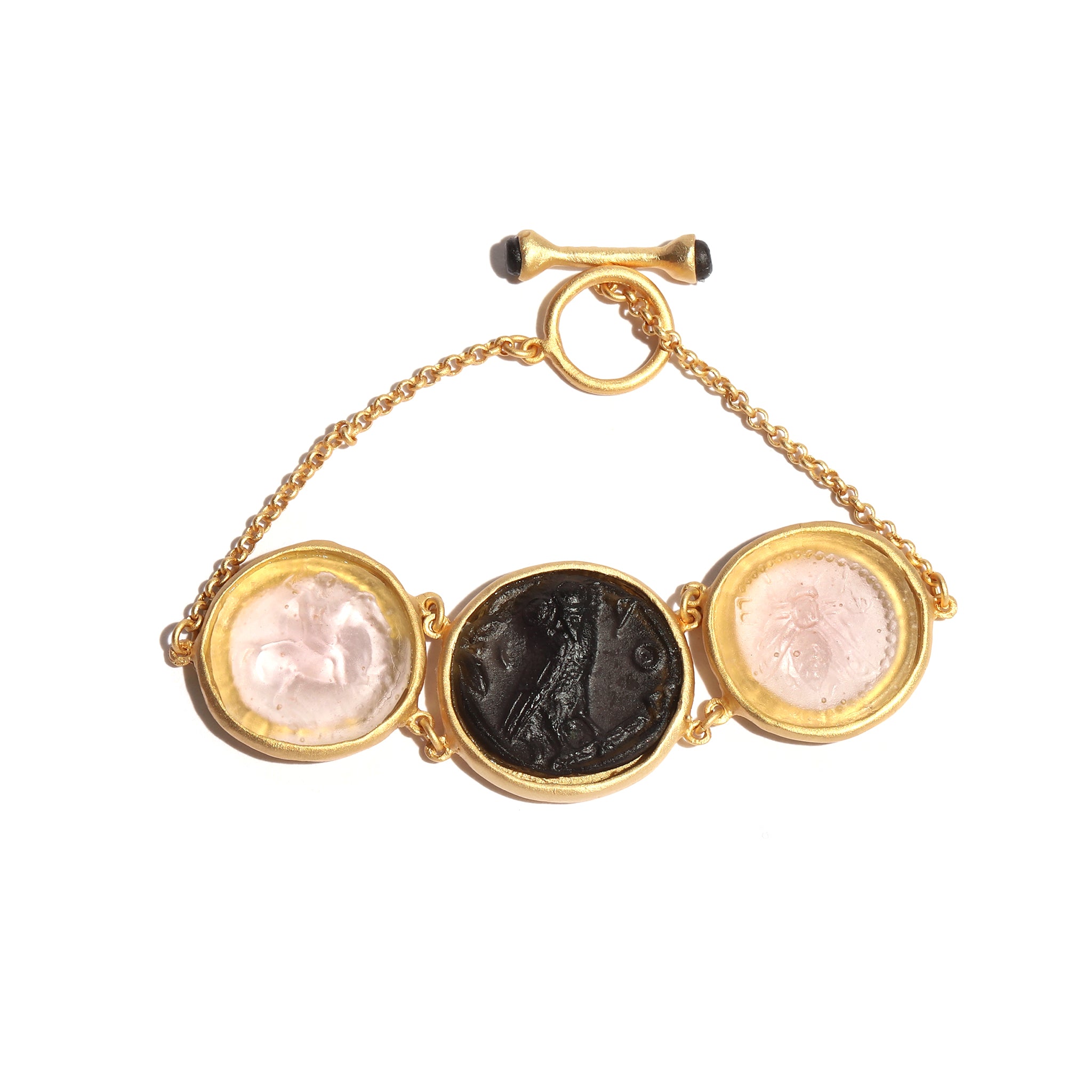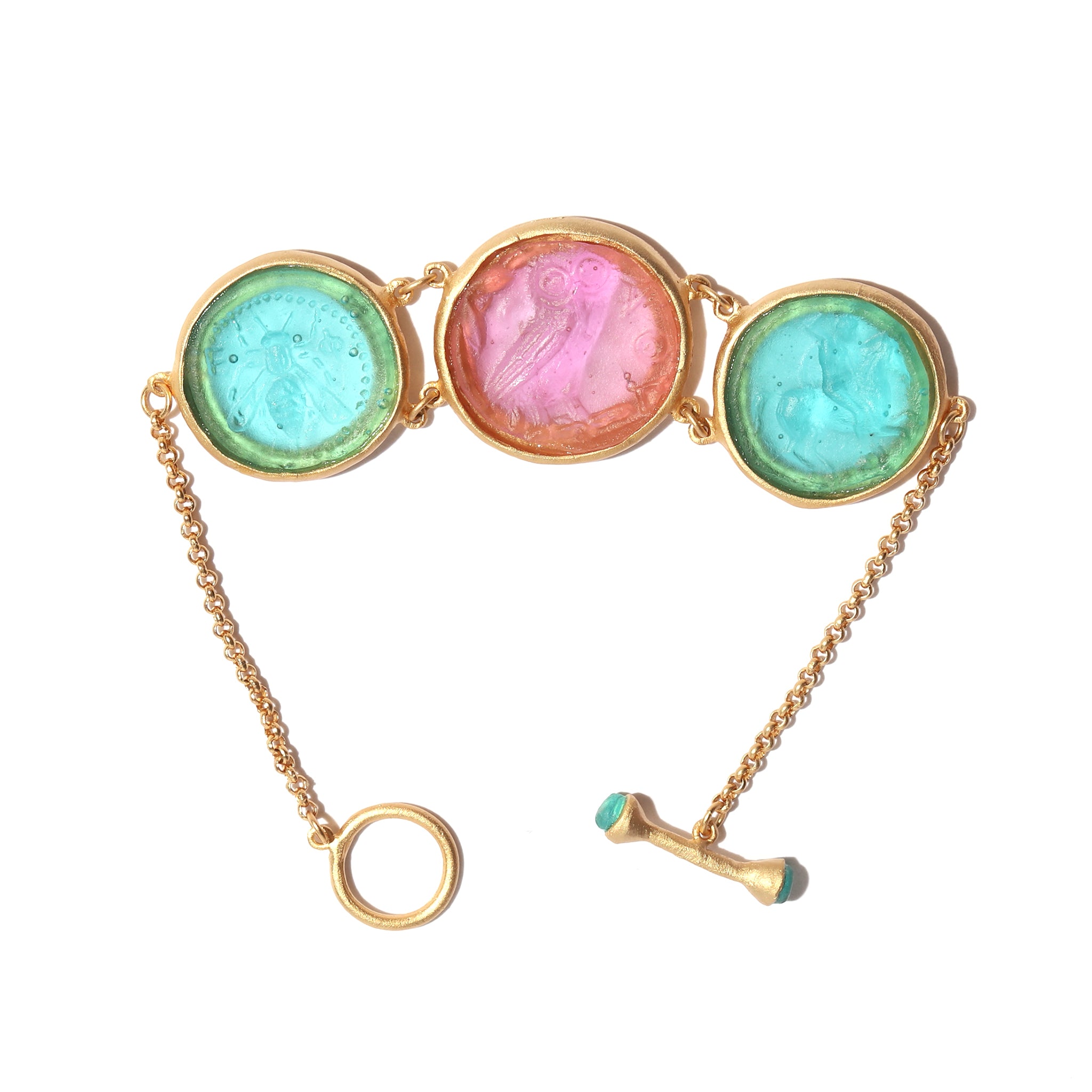 - Materials: Glass, 24K gold-plate, brass, toggle closure