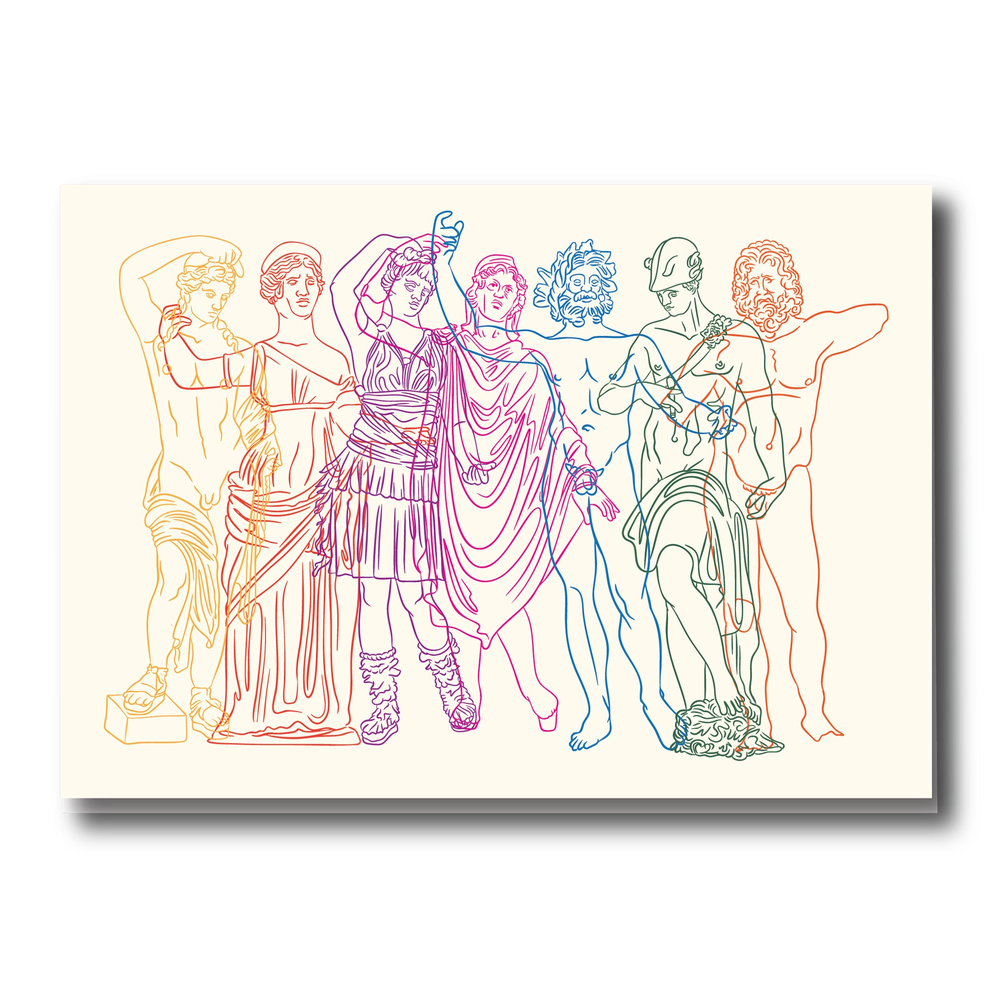 Designed exclusively for the Getty by Adam Dalton Blake, this striking greeting card features overlapping contour-line illustrations of gods inspired by artworks from the Villa's collection, each rendered in a different vivid color for a contemporary take on classical mythology. Blank inside for your own message, it’s perfect for celebrations, thank you notes, or any time you want to share a touch of classical inspiration.