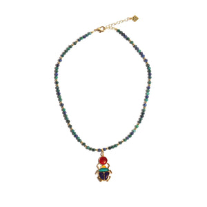Richly colored chrysocolla beads in variegated shades of blue and green form a delicate strand accented with warm gold‑tone spacers. At the center hangs a vividly enameled scarab pendant, a motif drawn from ancient Egyptian art and symbolism. Rendered in jewel‑like hues and framed in gold tone, the pendant brings a striking focal point to this refined necklace.