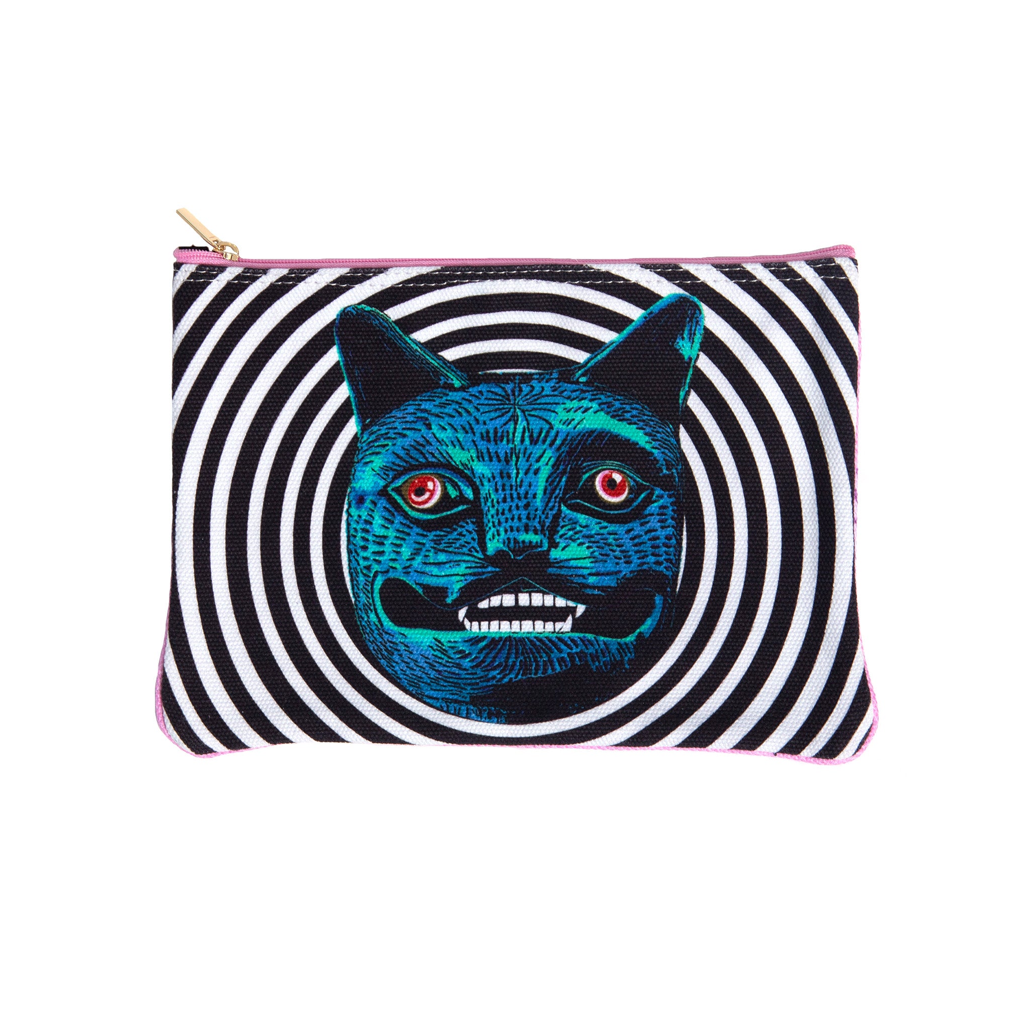 The sculpture reproduction of a cat, fondly known as Purrquoise, that inspired the design of this zippered pouch is made of Chinese porcelain. Glazed in a luminous turquoise, a hole on the lower part of the spine suggests that the cat originally served as an incense burner. Created for export to Europe, the cat was adorned in mid-eighteenth-century France with eyes in enameled glass and mounted on a gilt bronze stool with a richly ornamented cushion. These transformed pieces were highly desirable by the most discerning collectors. Purrquoise is said to have been part of the collection of the Marquise de Pompadour.